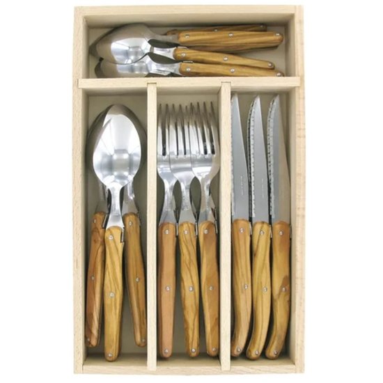 Elevate your dining experience with the Verdier Cutlery Set 24 Pc Olive Wood - a fusion of French artistry and functionality.