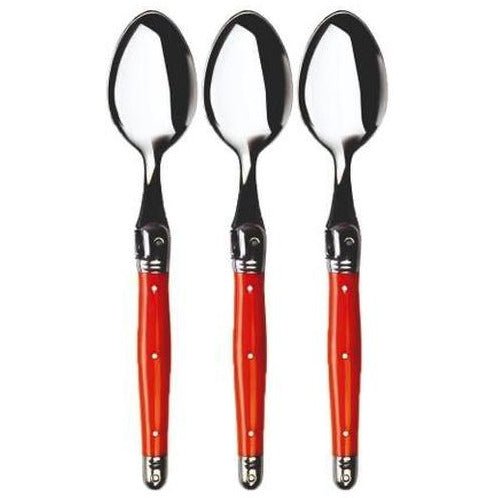 Enhance your dining experience with the AV726OL Andre Verdier Laguiole Debutant Range Refill Spoons. Made in France, these spoons are crafted from high-quality stainless steel with vibrant colored resin handles, adding a pop of color to your table setting. The trademark Laguiole Bee on the handle reflects the authenticity of these spoons.