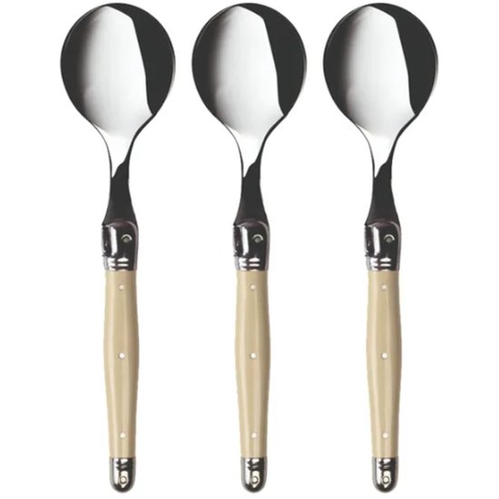 Enhance your dining experience with the AV721ILF Andre Verdier Laguiole Debutante Soup Spoons in Ivory. Crafted by Andre Verdier, these luxury soup spoons are designed to elevate your table setting. Here's what makes them stand out: