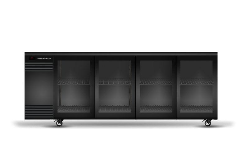 Quiet, high efficiency premium four glass sliding door bar fridge featuring dimmable LED lights, lockable doors, and eco-friendly natural refrigerant technology.