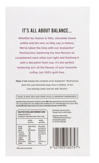 Avalanche 99% Sugar Free Mochaccino Coffee Sticks 10 x 16g