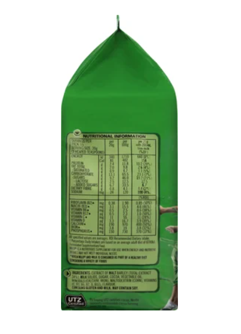 MILO is a nutrient rich, low GI choc malt powder drink providing kids the nourishing energy they need to take on the day. Simply add 3-heaped teaspoons of MILO to a glass of hot or cold skim milk for a delicious chocolate malt flavoured milk drink. MILO is great with breakfast, after school, before or after sport as a snack or as a hot chocolately malt drink after dinner. Made from four main ingredients: milk powder, malt barley, sugar and cocoa. • Contains 8 essential vitamins and minerals • Contains 15 serves of choc-malty goodness • Approximately 80% of the energy powering our MILO factory comes from BIOENERGY, a renewable energy source