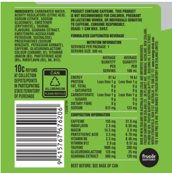 Carbonated Water, Acidity Regulators (Citric Acid, Sodium Citrate), Taurine, Guarana Extract (0.12%), Sweeteners (Acesulfame Potassium, Sucralose), Glucuronolactone, Caffeine, Colour (Caramel), Flavours, Inositol, Thickener (Xanthan Gum), Vitamins (Niacin (B3), Pantothenic Acid, B6, Riboflavin (B2), B12)