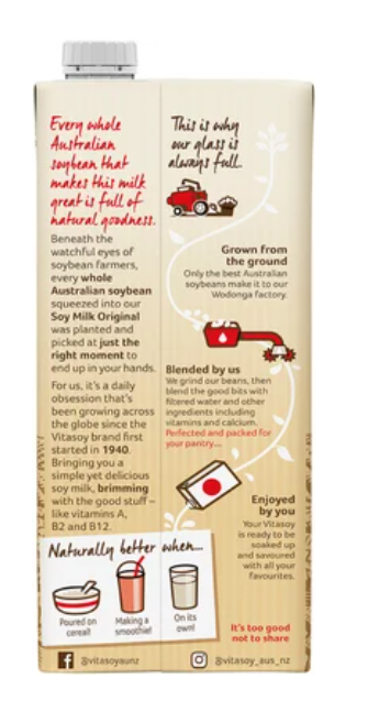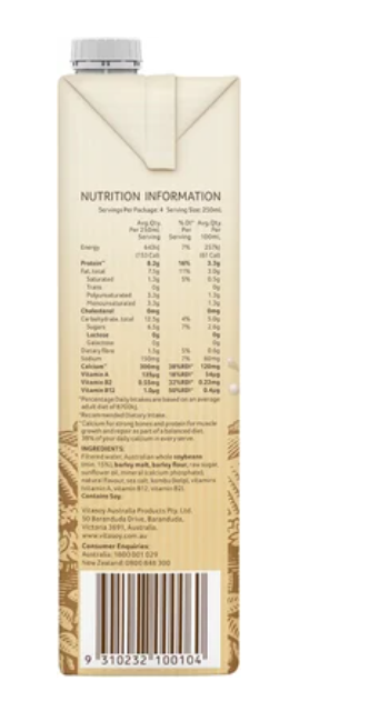Filtered Water, Australian whole SOYBEANS (min. 15%), BARLEY MALT, BARLEY FLOUR, Raw Sugar, Sunflower Oil, Mineral (Calcium Phosphate), Natural Flavour, Sea Salt, Kombu (Kelp), Vitamins (Vitamin A, Vitamin B12, Vitamin B).