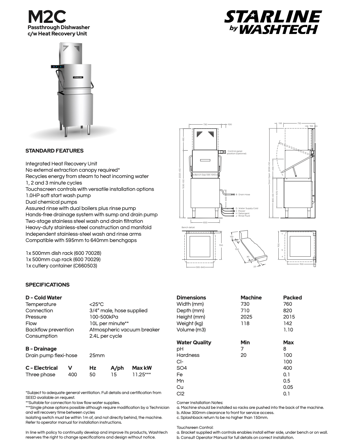 The Starline M2C is a powerful and highly efficient passthrough dishwasher that combines the latest technology with heavy duty stainless steel construction and componentry. With economical water consumption rates, integrated heat recovery system and powerful rinse heating, the M2C provides excellent wash results while being light on operating costs and the environment.