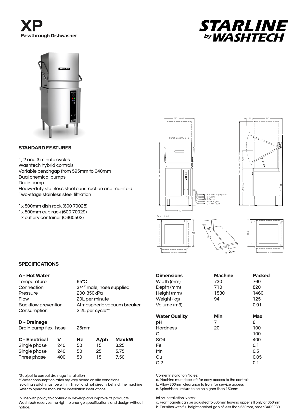 The Starline XP is a versatile, simple-to-use and easy-to-maintain passthrough dishwasher. With a low water consumption rate, powerful 1HP wash pump, and rapid rinse heating the XP is highly productive, economical to operate and light on the environment.