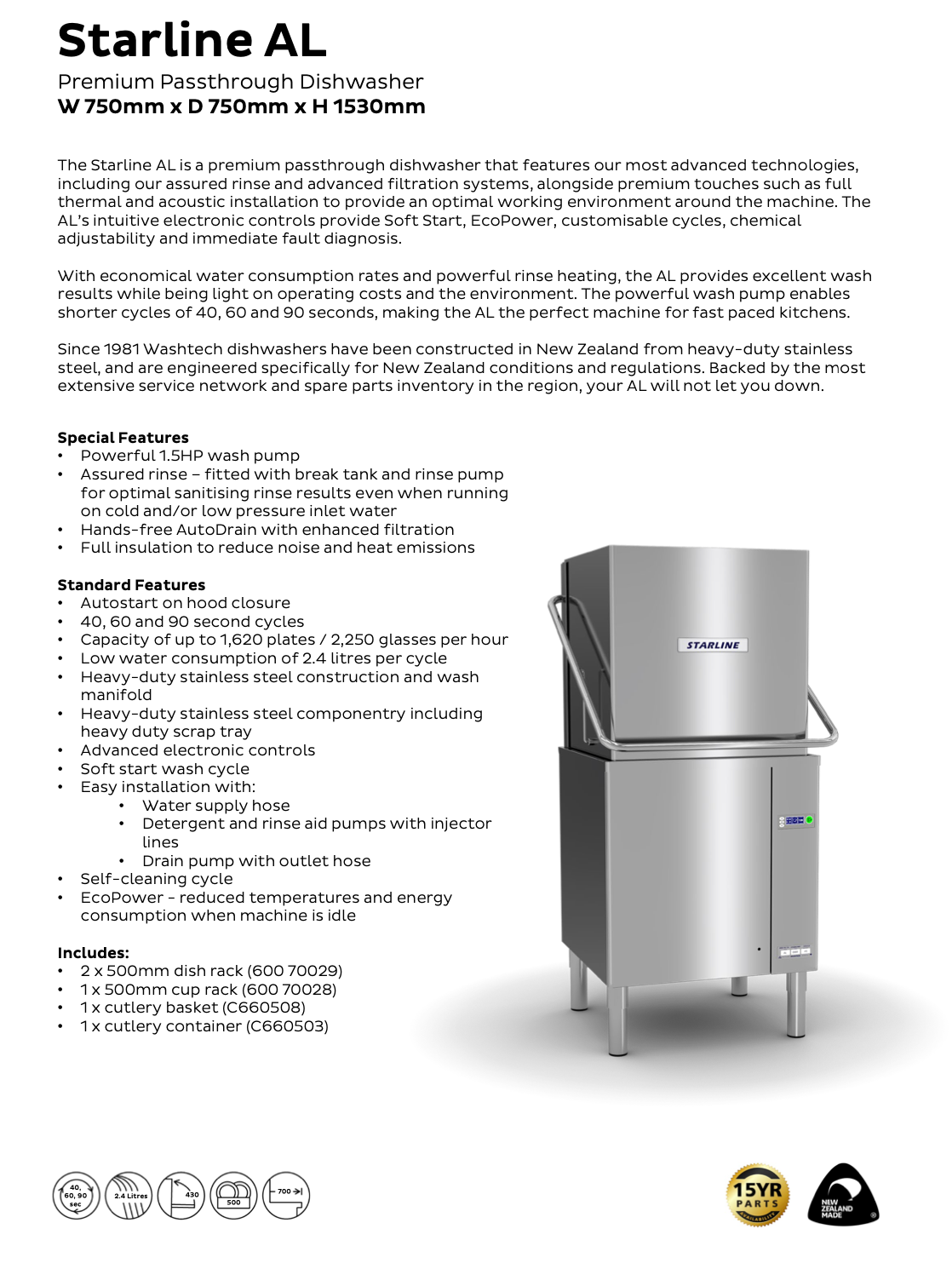 Since 1981 Washtech dishwashers have been constructed in New Zealand from heavy-duty stainless steel, and are engineered specifically for New Zealand conditions and regulations. Backed by the most extensive service network and spare parts inventory in the region, your AL will not let you down.