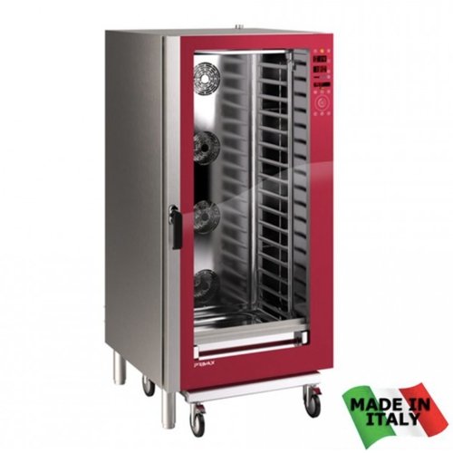 Made in inox; internal glossy finishing; external scotch-brite finishing; cooking chamber with rounded edges for easy cleaning; digital control; 200 adjustable programs; 4 phases cooking cycles; core probe included; Δt° cooking system; pre-heating; cooling; delayed cooking function; automatic fan rotation reverse; double speed fan; humidity control; chamber light; double glass door easy to open and clean; reversing door (optional); snap-on seals on cooking chamber; arranged for manual (optional) or automatic washing system (optional); removable internal grids-rack for easy cleaning; 70 mm vertical distance between grids; arranged for USB connection (optional); HACCP control (optional).