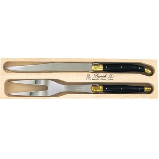 Indulge in the art of culinary craftsmanship with the Verdier Carving Set Brass, meticulously crafted in France. This set features a 28cm stainless steel knife with handles made from vibrant colored resin, exuding elegance and functionality. The iconic Laguiole Bee trademark adorns the handle, symbolizing exceptional quality and heritage. Not just visually stunning, this set is also dishwasher safe for convenience, and comes beautifully packaged in a wooden gift tray.