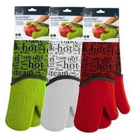 The ZEAL Print Trim Double Oven Glove combines style and functionality to provide exceptional heat resistance up to 250°C, ensuring reliable protection from steam and boiling water. Its snug fit offers a secure grip, while the waterproof design with fabric trim enhances durability. These thick, protective gloves offer superior insulation against heat, and the joining strip adds extra heat protection. With a measurement of 94cm from fingertip to fingertip, this pack of 6 gloves is perfect for any kitchen. Available in Red, Lime, and Black/White.