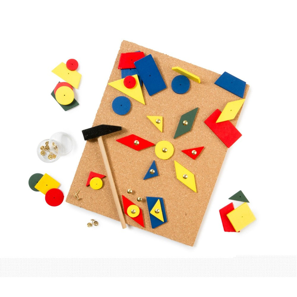 Young children (4+ years old) can create colourful pictures by hammering these vibrantly coloured wooden pieces onto the soft reusable corkboards. This fun activity is ideal for developing fine motor skills. A hang sell pack consists of corkboard (300mm x 255mm) wooden farm animals, Fencing and people, tacks and wooden hammer.