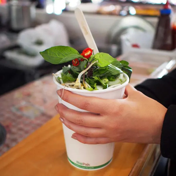 32oz white paper bowls are lined with a plant-based bioplastic, not fossil-fuel plastic. Certified industrially compostable. Suitable for hot/cold food and soup-safe.