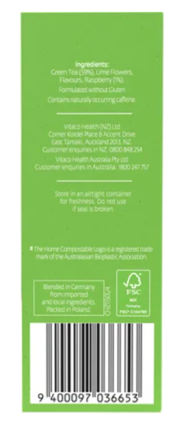 Green Tea (59%), Lime Flowers, Flavours, Raspberry (1%).
