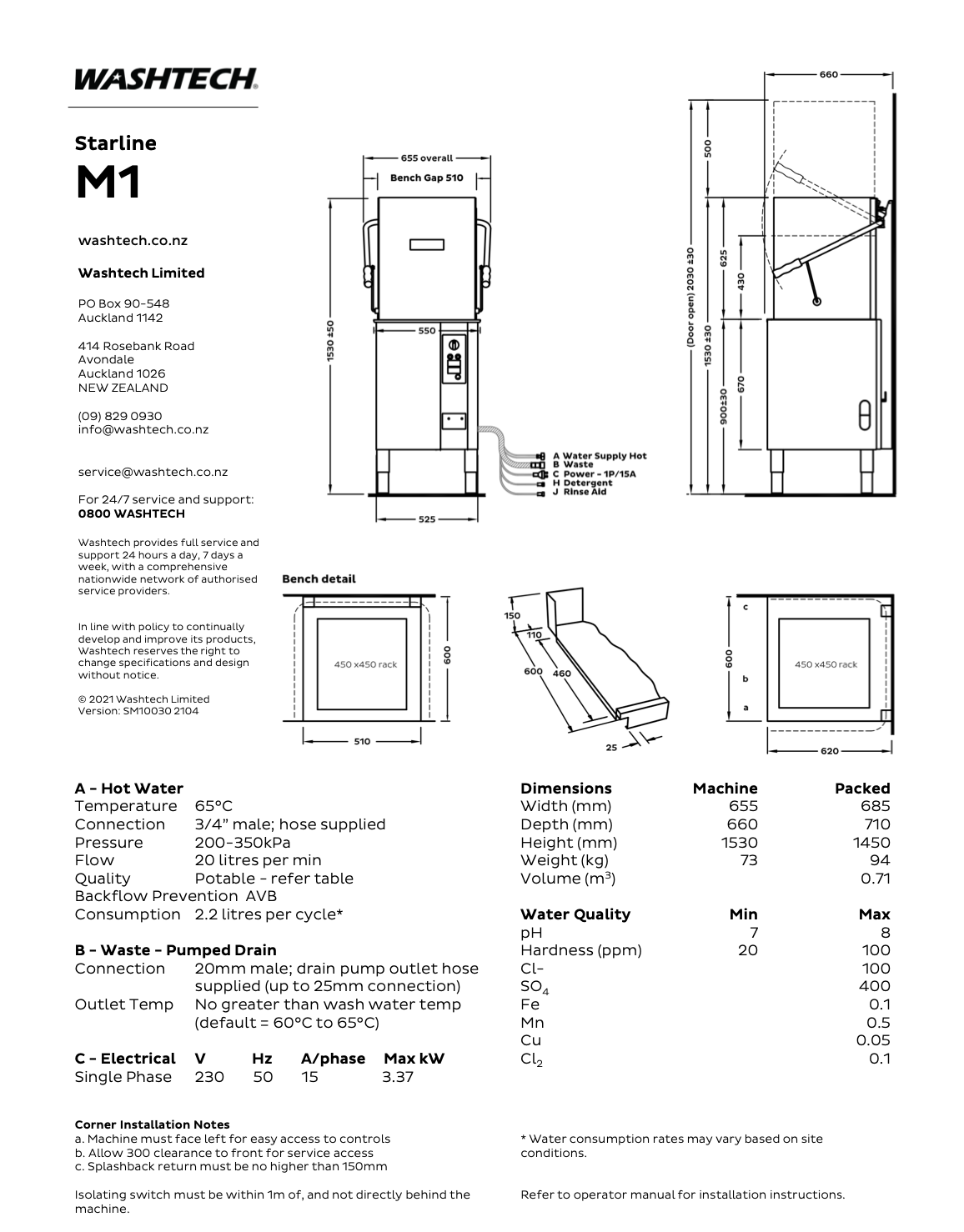 The M1 is an ideal solution where space in a restaurant, cafe or aged care facility is at a premium. With the use of 450mm racks the M1 requires a bench gap just of 510mm and is compatible with 600mm deep benching. The 450mm plastic dishracks hold sixteen x 230mm plates, only 2 less than the 500mm dishracks which hold 18 plates.