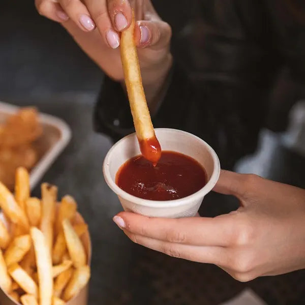 Our 120ml BioCane sample cups are made from rapidly renewable plant fibre pulp, a by-product of the sugar refining industry. This sustainable cups fits the 90 / 120ml sugarcane sauce cup lid (B-SCL-90/120-N).