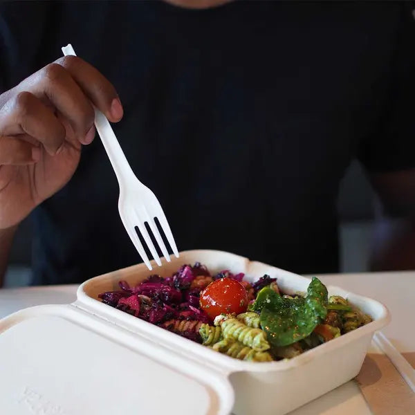 Our 6.5" compostable fork is made from a plant-based bioplastic, produced from a rapidly renewable starch. This bioplastic fork has a smaller carbon footprint than conventional plastic. This disposable fork is certified industrially compostable. Australian states are implementing single-use plastic bans. Bioplastic cutlery is banned in SA, ACT, WA, NSW & VIC.