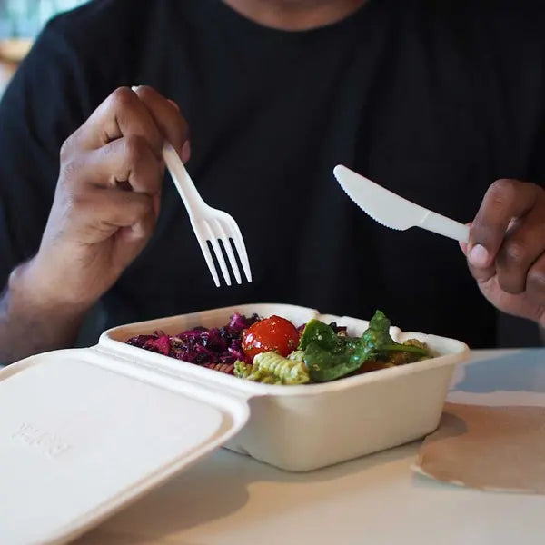 Our 6.5" compostable knife is made from a plant-based bioplastic, produced from a rapidly renewable starch. This bioplastic knife has a smaller carbon footprint than conventional plastic. This disposable knife is certified industrially compostable. Australian states are implementing single-use plastic bans. Bioplastic cutlery is banned in SA, ACT, WA, NSW & VIC.
