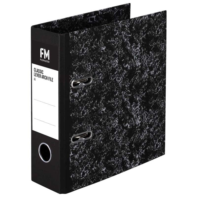 THE CLASSIC MOTTLED BLACK CARDBOARD LEVER ARCH FILES FEATURE RADO FITTING ON THE FRONT COVER