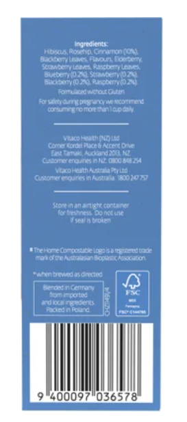 Hibiscus, Rosehip, Cinnamon, Blackberry Leaf (10%), Flavour, Elderberry, Strawberry Leaf (1%), Raspberry Leaf (1%), Blueberry (0.2%), Strawberry (0.2%), Blackberry (0.2%), Raspberry (0.2%)