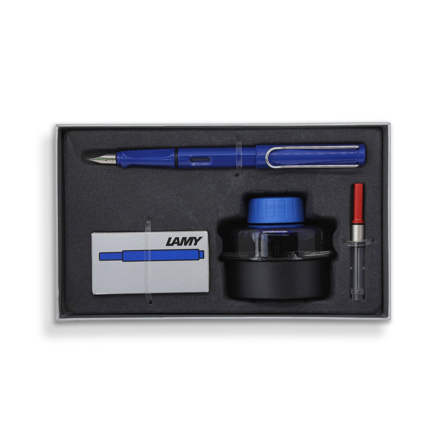 Fountain pen: Blue, non fade ABS plastic body and clip, sprung metal clip, ergonomic grip, polished steel nib. With ink cartridge Lamy T 10 blue.