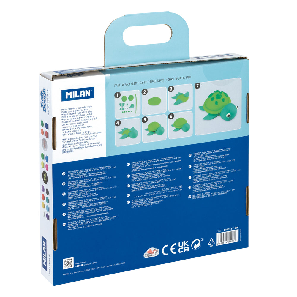 Milan wheat-based modelling dough kit in assorted colours. Briefcase content: 16 cans of 30 g. 8 Basic colors: white, yellow, red, lilac, purple, blue, green and black. 4 Neon colors: yellow, green, pink and blue. 4 Glitter colors: orange, green, red and blue. Soft Dough is consistent and elastic, easy to mould. New colours can be created by combining two or more colours. It leaves no residues on the hands. Ingredients of vegetal origin (contains gluten).