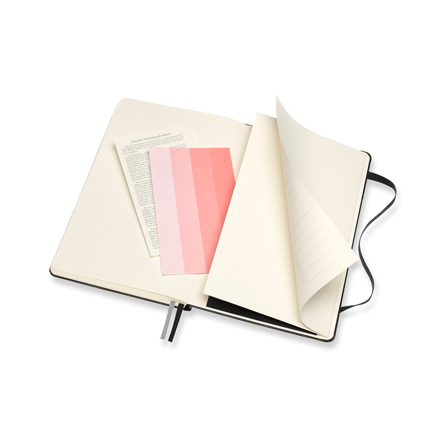 Hard cover, rounded corners, elastic closure and double bookmark ribbon. Ivory-colored, 120 gsm, acid-free dotted paper. Personal data and contents list, numbered pages and pen test pages. Flap with key page for your bullets and colour codes. Set of stickers to customise your notes. 'In case of loss' notice printed on the flyleaf and expandable inner pocket in the back. Lies flat, opens at 180 degrees. The history of Moleskine is inside.