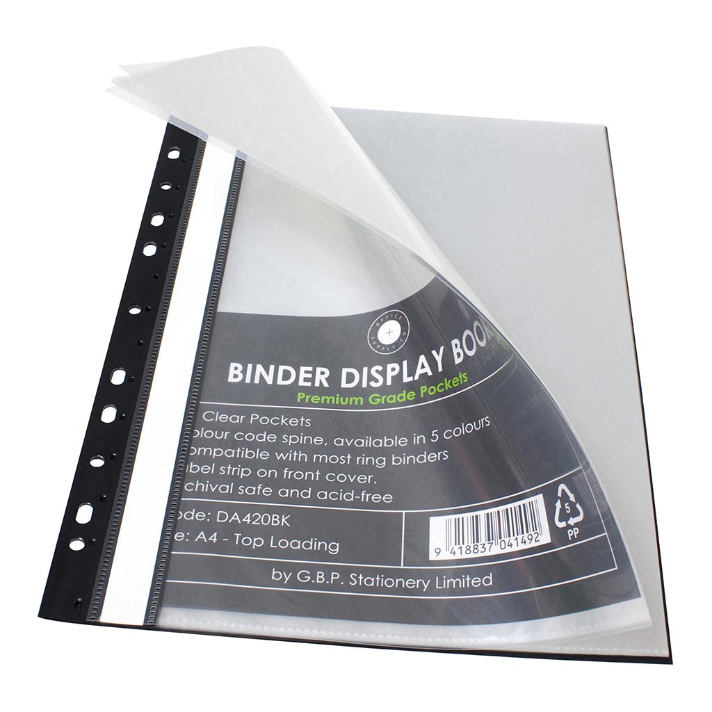 Office Supply Co Binder Display Book fits into most ringbinders. 20 clear top loading pockets with a label strip on the front cover. Available in five colours so you can colour code. Black colour. A4 size. 20 pockets. 40 page capacity.