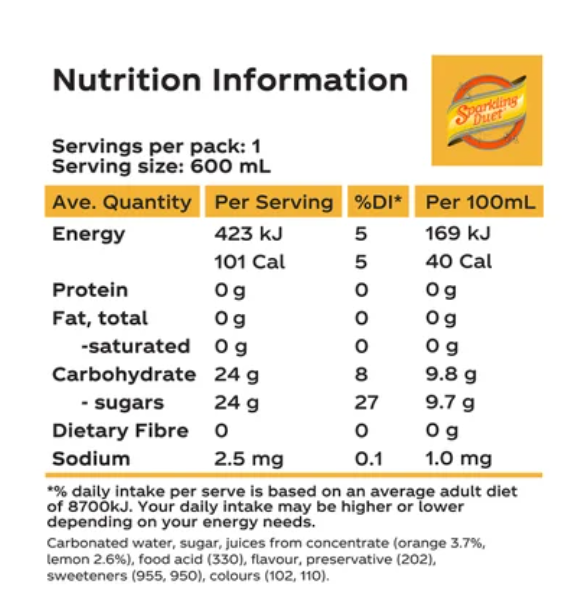 Carbonated Water, Sugar, Juices From Concentrate (Orange (3.7%), Lemon (2.6%)), Food Acid (330), Flavour, Preservative (202), Sweeteners (955, 950), Colours (102, 110)