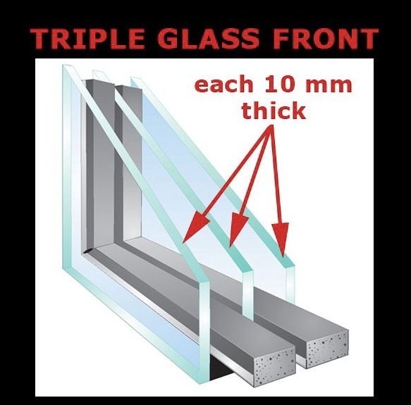 • triple glazed front with heated wire filaments to stop condensation