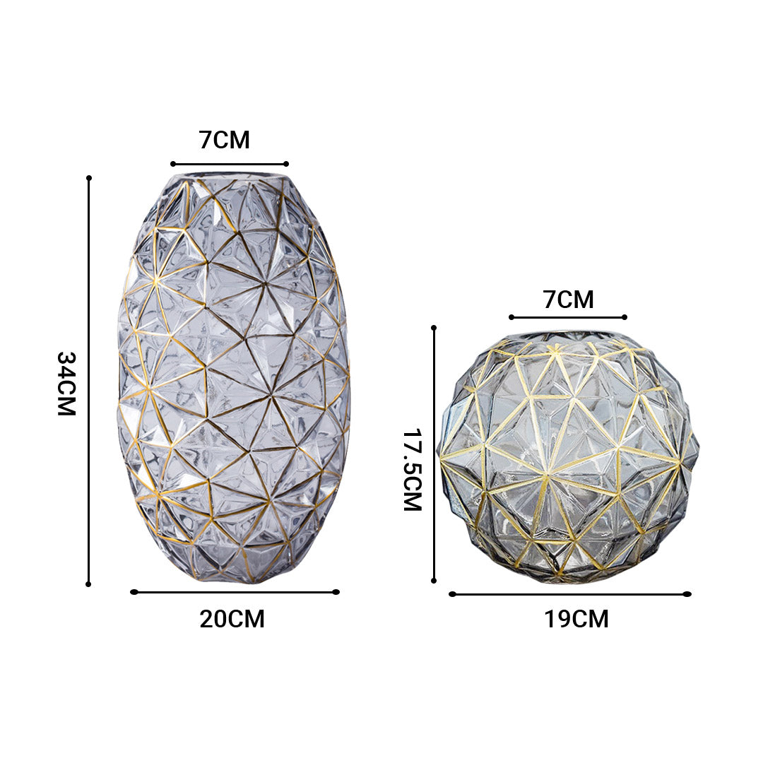 SOGA 2X Grey Colored Diamond Cut Glass Flower Vase Round Jar Home Decor with Gold Accent Large and Medium Set