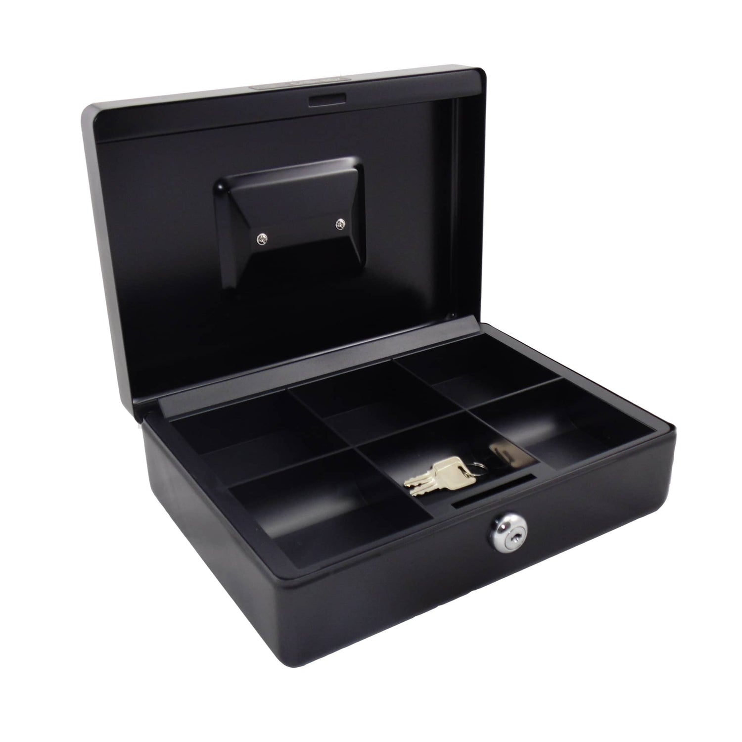 - Strong metal 10 inch cash box for secure storage of cash, valuables, and important documents