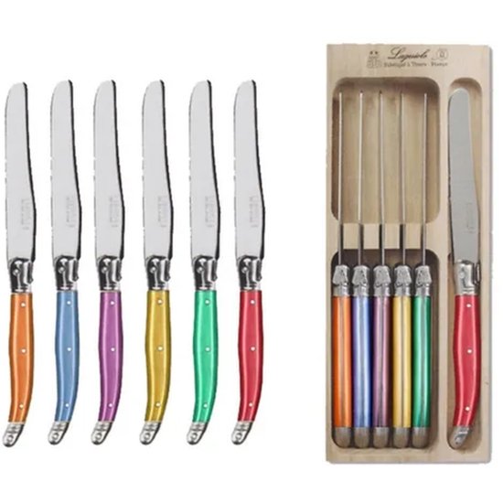 Upgrade your dining experience with the boxed six-piece Verdier Table Knife Set. Crafted by Andre Verdier in the Laguiole Debutant Range, these knives are 100% made in France and boast stainless steel blades. The handles are not only durable but also stylish, made from stainless steel with a resin core and featuring the trademark Laguiole Bee on the handle.