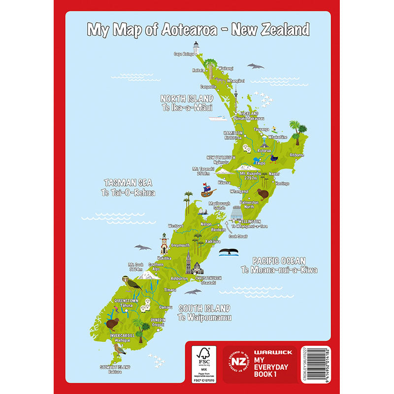 This A4 Warwick My Everyday Book 1 is daily exercise book with 64 unruled pages and is perfect for school use. It features a 4-staple binding on the spine and a gloss laminated cover for longer-lasting use. It contains reference material, which include Maori and English greetings, academic works and an illustrated map of New Zealand, as well as a handy name plate on the front that allows for easy identification.